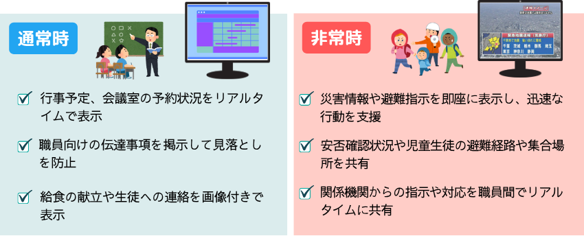 災害時、学校が住民の避難場所になることも想定されます。そんな時は、被災者のための最新情報をモニターで配信して共有することができます。普段から情報発信システム確立されていれば、いざというときに安心です。