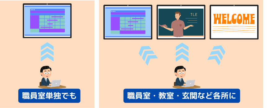 学校内に眠っている大型テレビやモニターはありませんか。職員室のホワイトボードに代わり「情報共有モニター」になって効率的に情報発信できます。学校のデジタルサイネージとして有効活用しましょう。